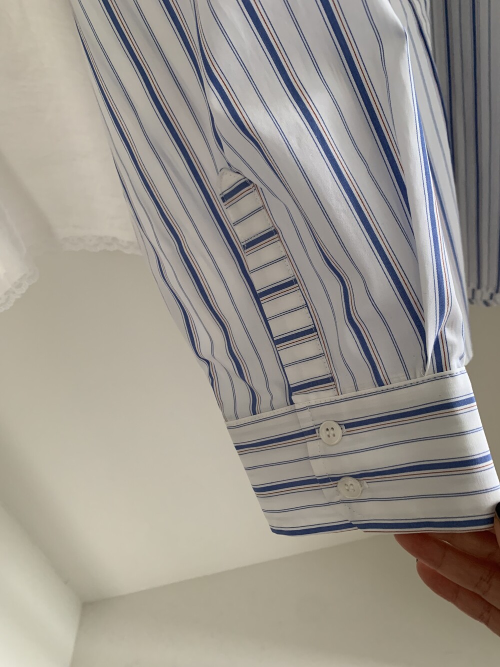 깨긋한 화이트 위에 리듬감있게 배열된 스카이 블루 스트라이프는 지적이면서도